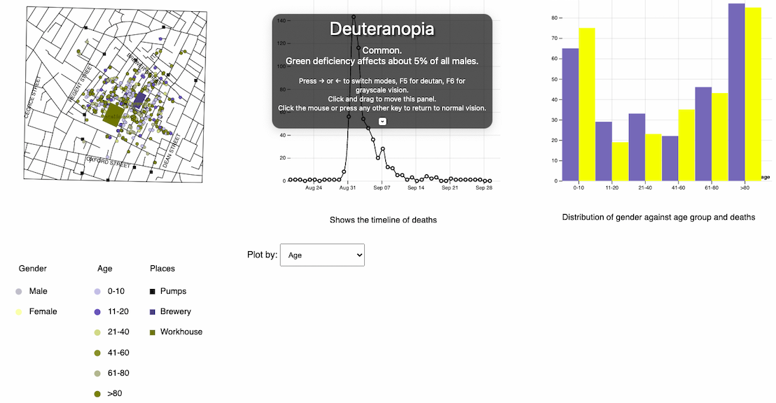 a.I have used color oracle to check the deuteranopia common color blindness and selected d3.schemeSet3 for gender colors and d3.schemePaired for age group colors.