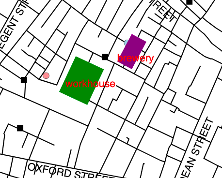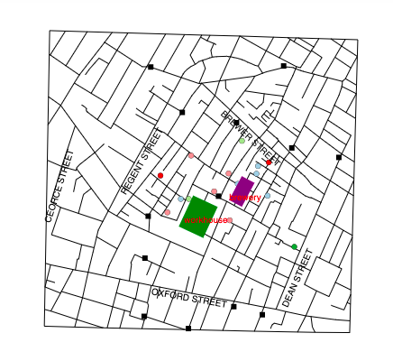 b. Map with 5 Street names labels, work house and brewery along with Zoom and pan functions within SVG view-box.
